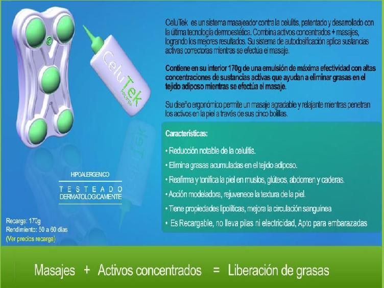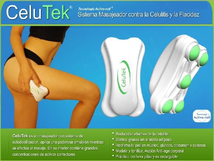 CeluTek es un sistema masajeador contra la celulitis y la Flacidez, diseñando con la última tecnología dermo estética, con el objetivo de reducir de forma efectiva la celulitis, eliminando grasas y reafirmando los tejidos en la piel.