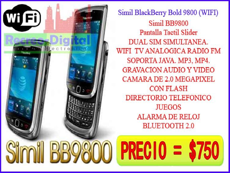 Simil BB9800 Pantalla Tactil Slider DUAL SIM SIMULTANEA. WIFI TV ANALOGICA RADIO FM SOPORTA JAVA. MP3, MP4. GRAVACION AUDIO Y VIDEO CAMARA DE 2.0 MEGAPIXEL CON FLASH DIRECTORIO TELEFONICO JUEGOS ALARMA DE RELOJ BLUETOOTH 2.0 Visita nuestra web: http://www.recreo-digital.tk/ |