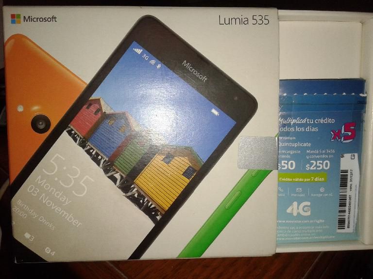 El Microsoft Lumia 535 es el primer smartphone Lumia con marca Microsoft en lugar de Nokia. Supone una actualización al Lumia 530 y cuenta con una pantalla qHD de 5 pulgadas, procesador quad-core a 1.2GHz, 1GB de RAM, 8GB de almacenamiento interno, ranura microSD, cámara trasera de 5MP con flash LED, y cámara frontal de 5MP para selfies.ENTREGO CON CAJA Y FACTURA (NO TIENE CARGADOR)Para Movistarhttp://www.smart-gsm.com/moviles/microsoft-lumia-535