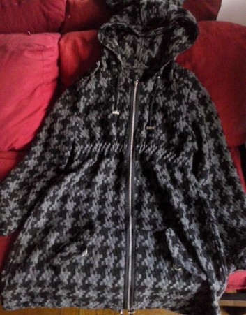 Campera larga con cierre y capucha, gris con negro simil tejido rustico y grueso. Abrigada poco uso, perfecto estado. Entallada hasta por debajo del pecho.