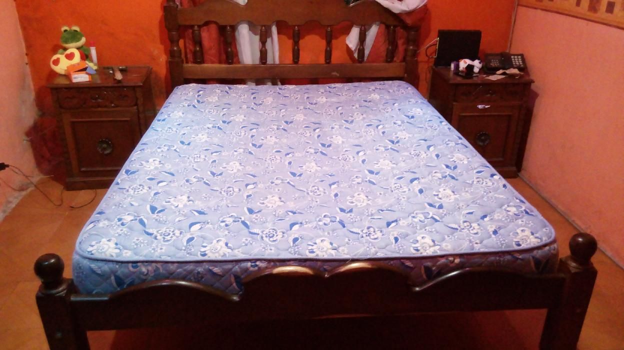 Cama de 2 plazas de algarrobo con 2 mesas de luz antiguas y colchon suavestar(1año de uso)
