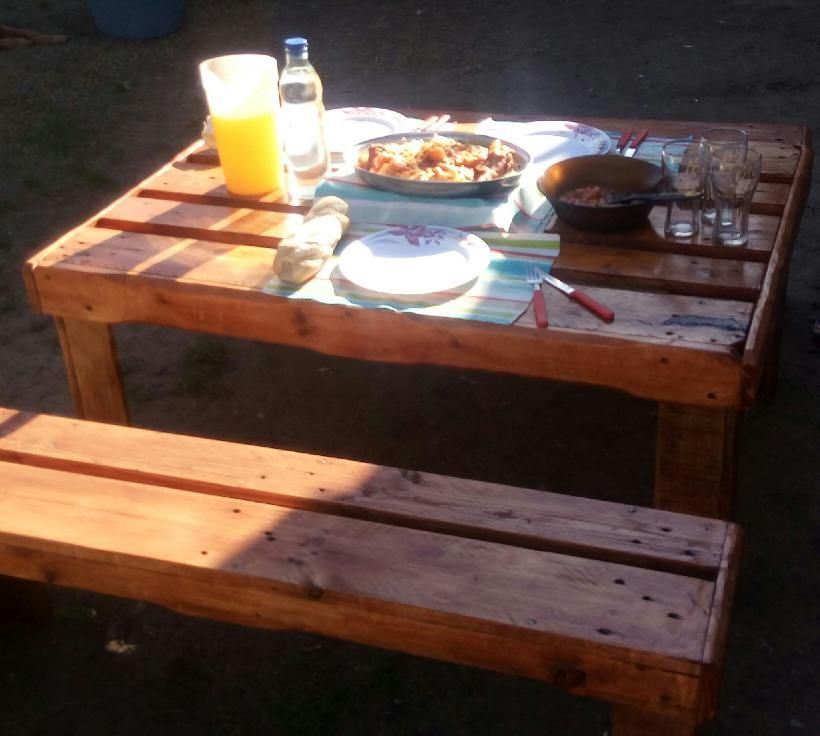 Mesa de palets 1,20 cm x 80 cm y 50 cm de altura y bancos de 1,20 cm x 30 cm todo con madera reciclada, ya lijado y barnizado los bancos entran debajo de la mesa para poder ahorrar espacios como se ve en foto llamar al (0237) 481 2823