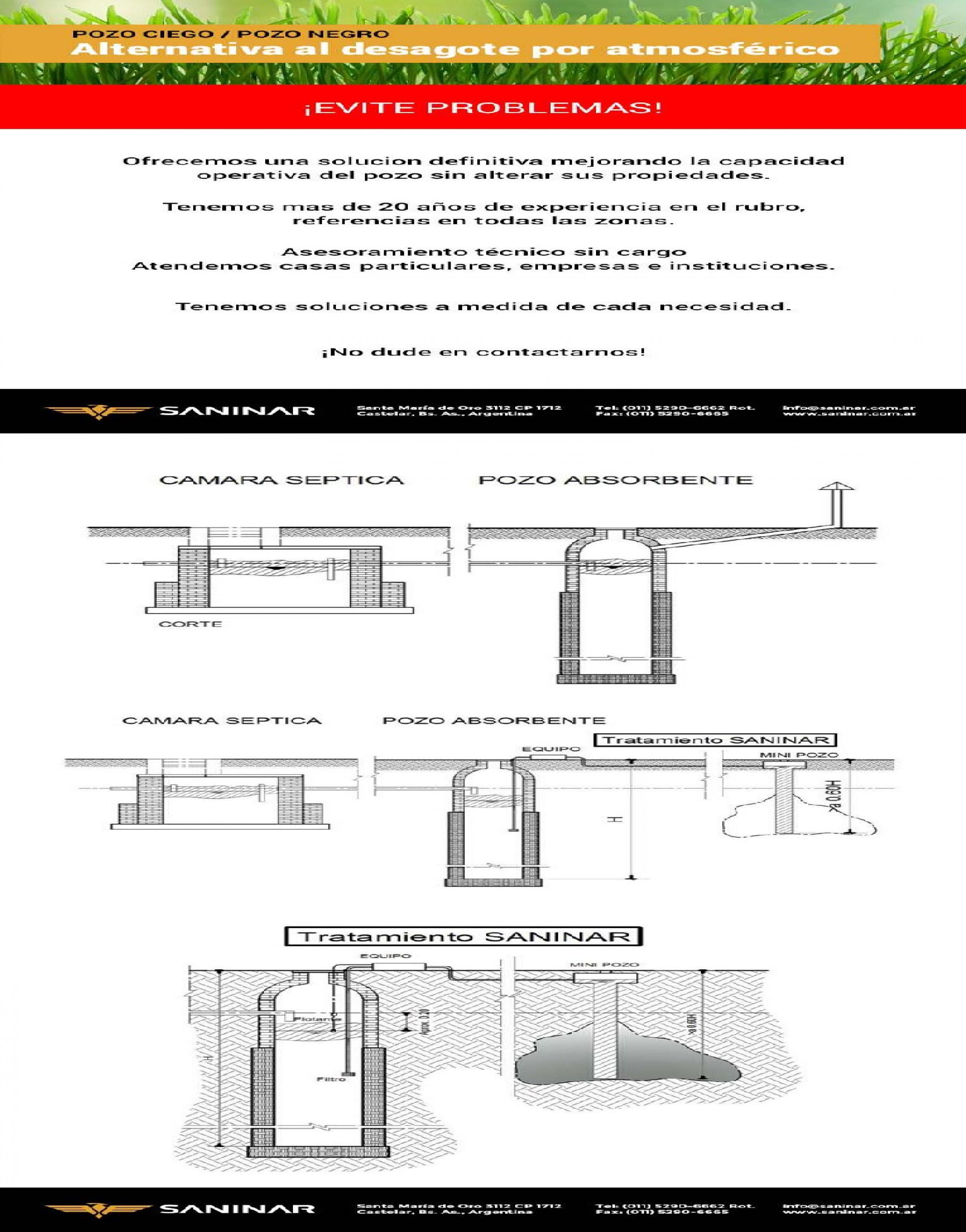 Nuestra empresa tiene una solución definitiva transformando tu viejo pozo en una cloaca particular, sin importar el volumen de consumo. Sistema de funcionamiento automático que suprime al camión atmosférico. Construcción de pozos ciegos y cámaras sépticas, conexión a cloacas, interconexiones. En casa de familia o empresas. Referencias comprobables en todas las zonas, instalaciones llave en mano y a medida presupuestos sin cargo.