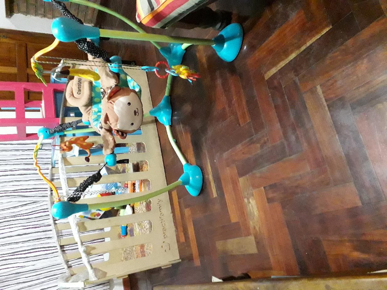 Jampi mono Carestino poco uso; verde y turquesa.Corralito madera medidas 130x150x61cm.