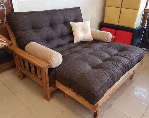 Estructura de madera Pino Cipres Con parrillas reforzadas de 4 x 1.5 Pulgadas.Medidas:Posición sillónLargo 1,55 mtrProfundo 1,00 mtrPiecera 1,40 x 0,50Posición Cama1,90 x 1,40INCLUYEFuton 2 cuerpos pieceraColchón con costuras REFORZADAS \"46 botones\"TALLER SJ : AV SARMIENTO 42 SUR DEPARTAMENTO JACHAL SAN JUAN