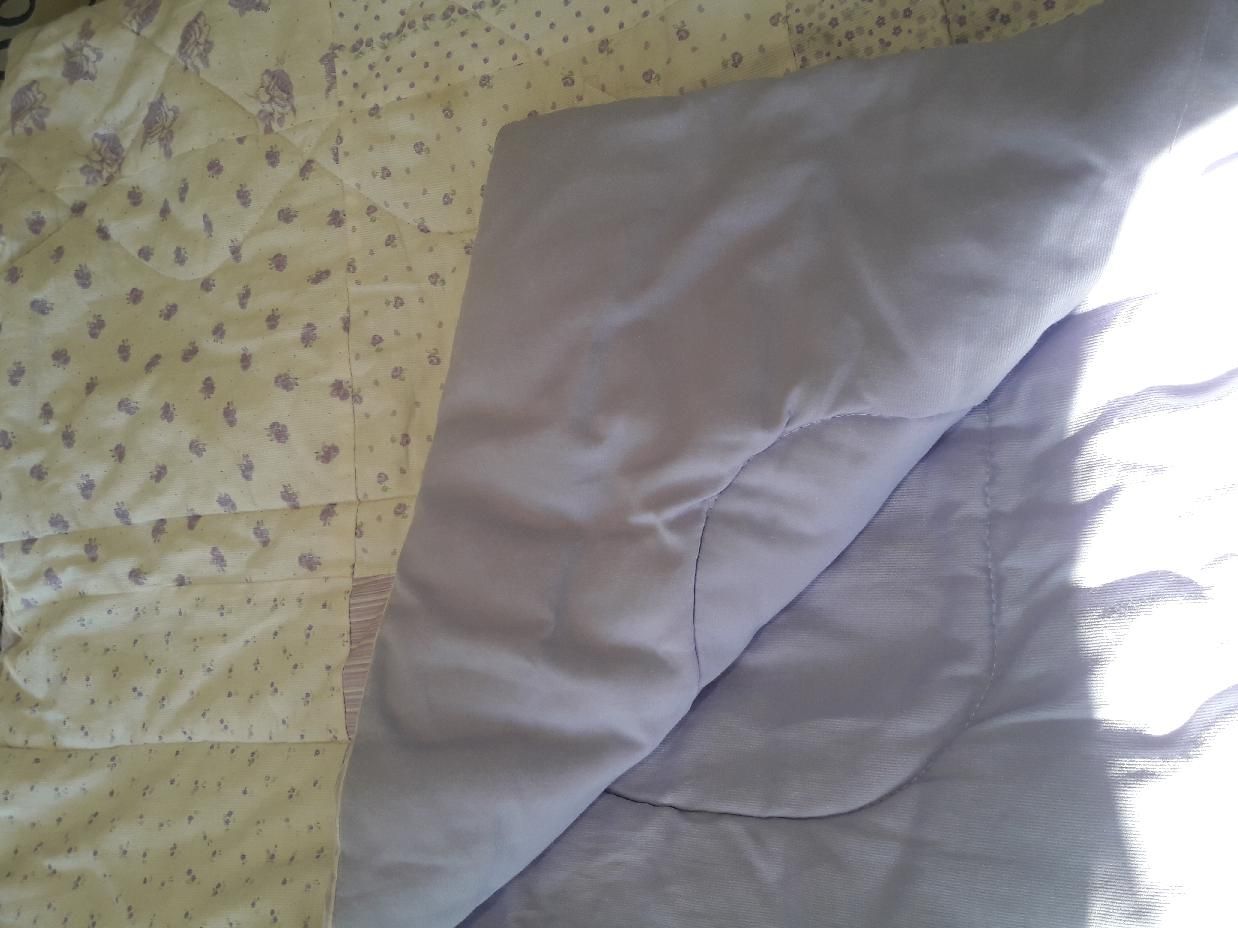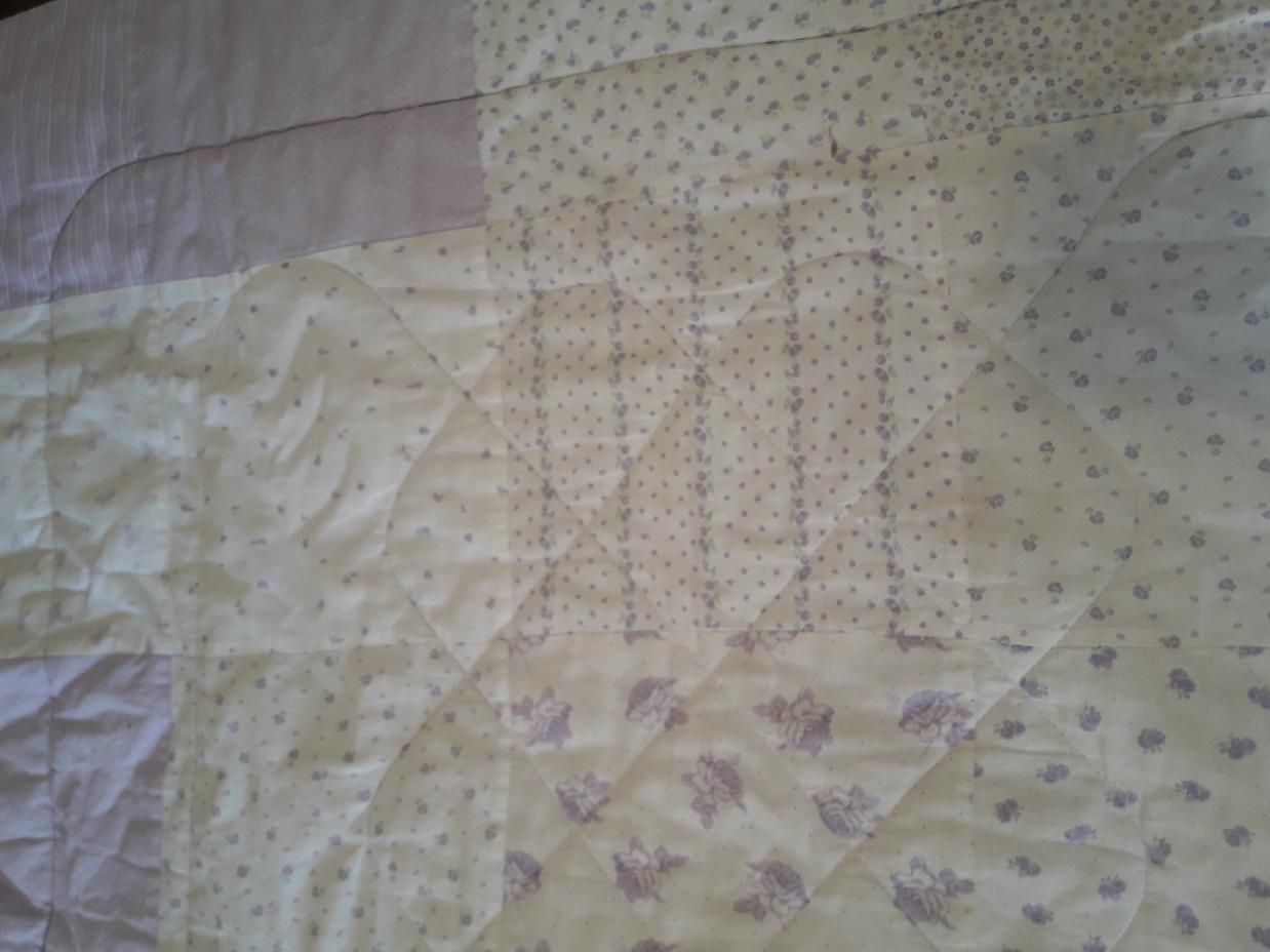 Acolchado parches tonos lila y blanco y chichonera lila.
