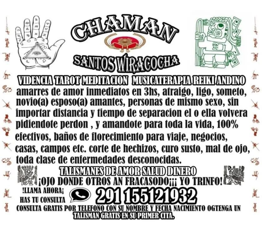 CHAMAN SANTOS WIRACOCHA, realizo ceremonia y rituales incas, dedicadas a la diosa madre pachamama y a dios wiracocha, para atraer la prosperidad, salud, exito, fama y fortuna, unico con el poder y conocimiento inca para realizar amarres efectivos destruir hechizos, brujerias, maleficios, salamientos y toda clase de enfermedades, amuletos, valzamo para el amor, le mostrare rl rostro del enemigo oculto en vaso con agua, sin que usted diga nada, yo le dire todo, trabajos personales o a distancia, tarot en directo las 24 horas, llama ahora 291155121932