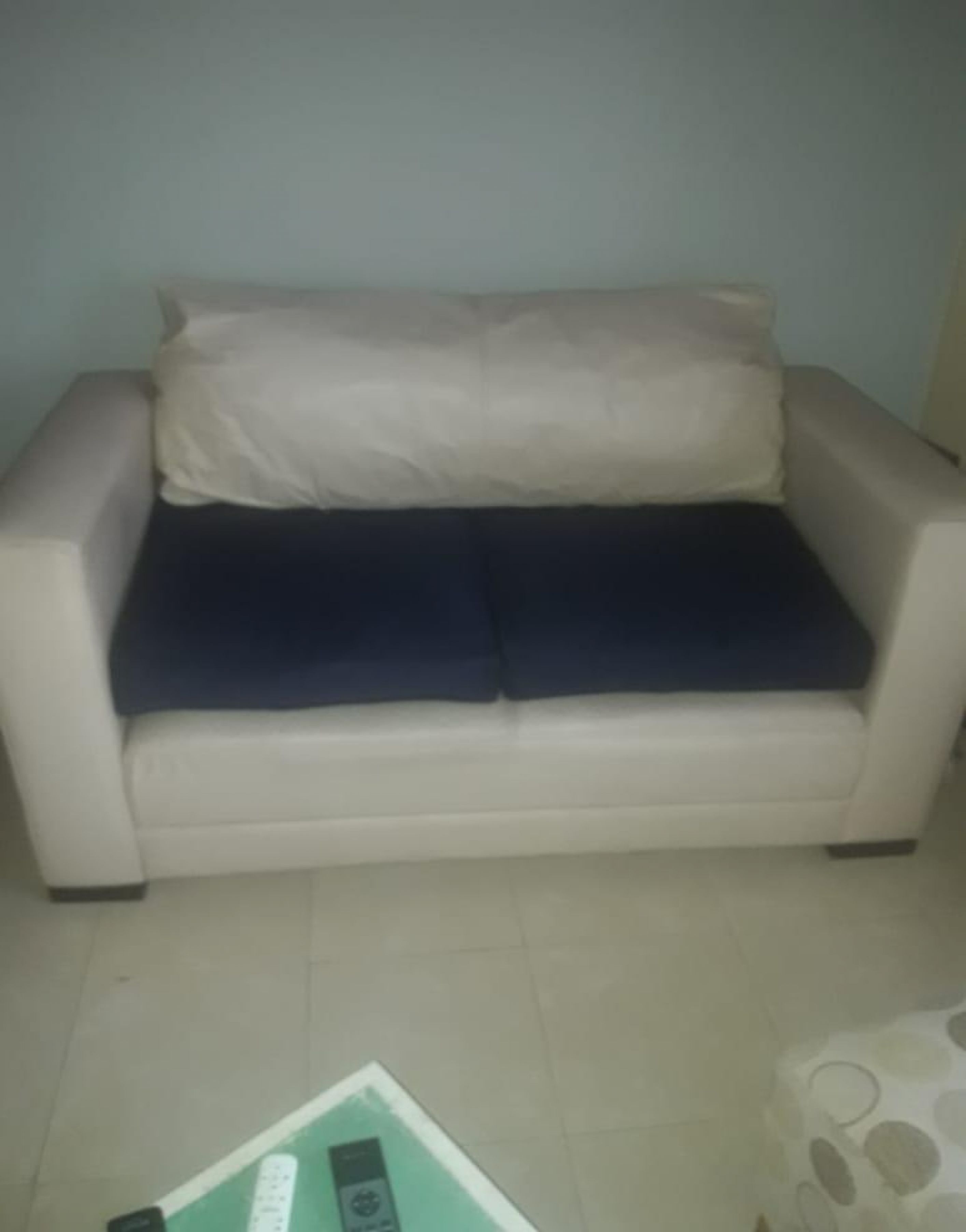 Sillón de 1.40X0.80 de profundidad y 0.70 de Altura.Con almohadones azules.