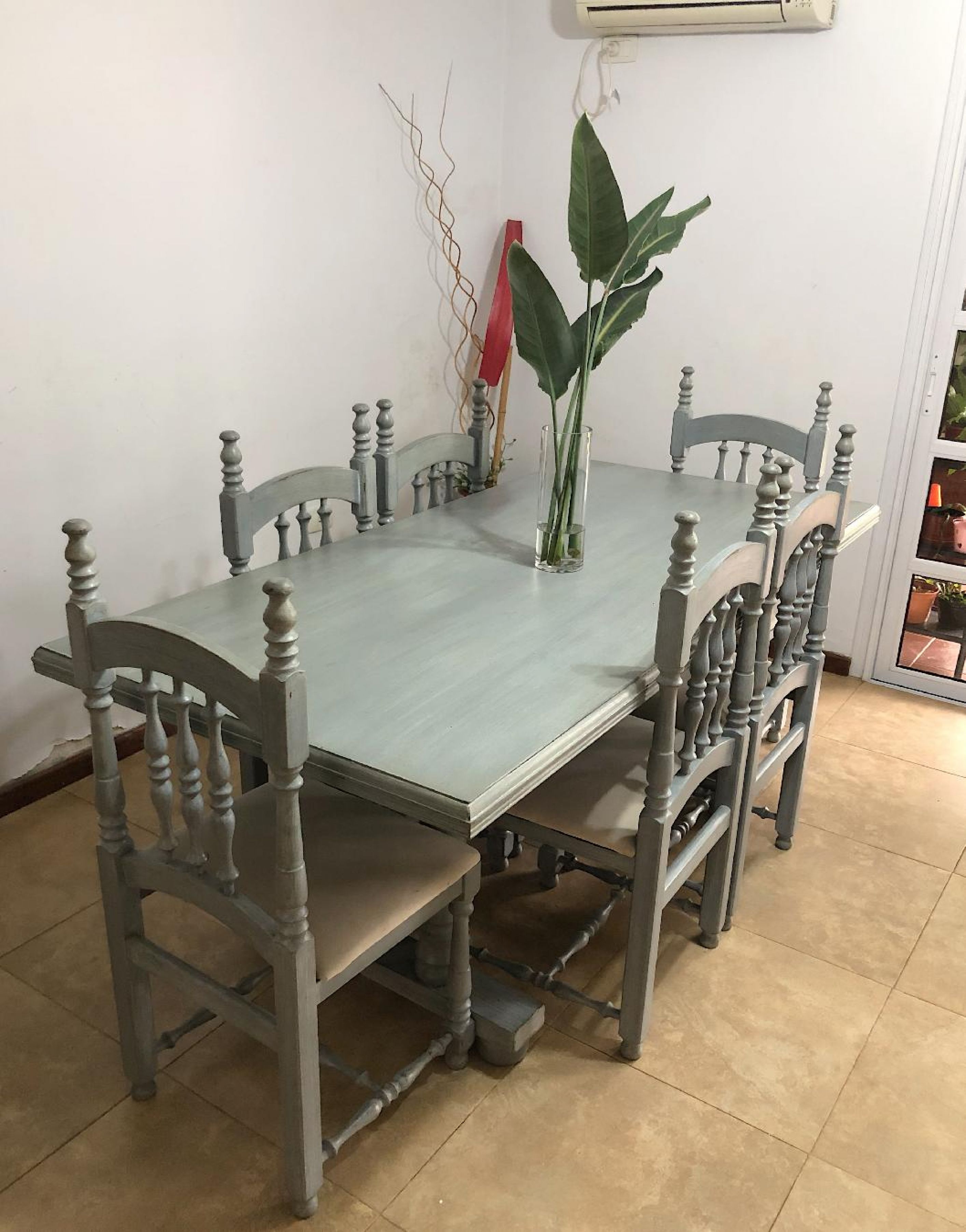 En excelente estado! Madera maciza, pintada color gris. 6 sillas tapizadas Medidas de la mesa 180x85 x 80 de alto