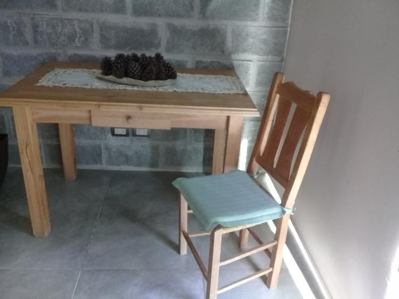 Vendo mesa 1,20 x 0,80 m de pino en buen atado con 4 sillas con almohadones