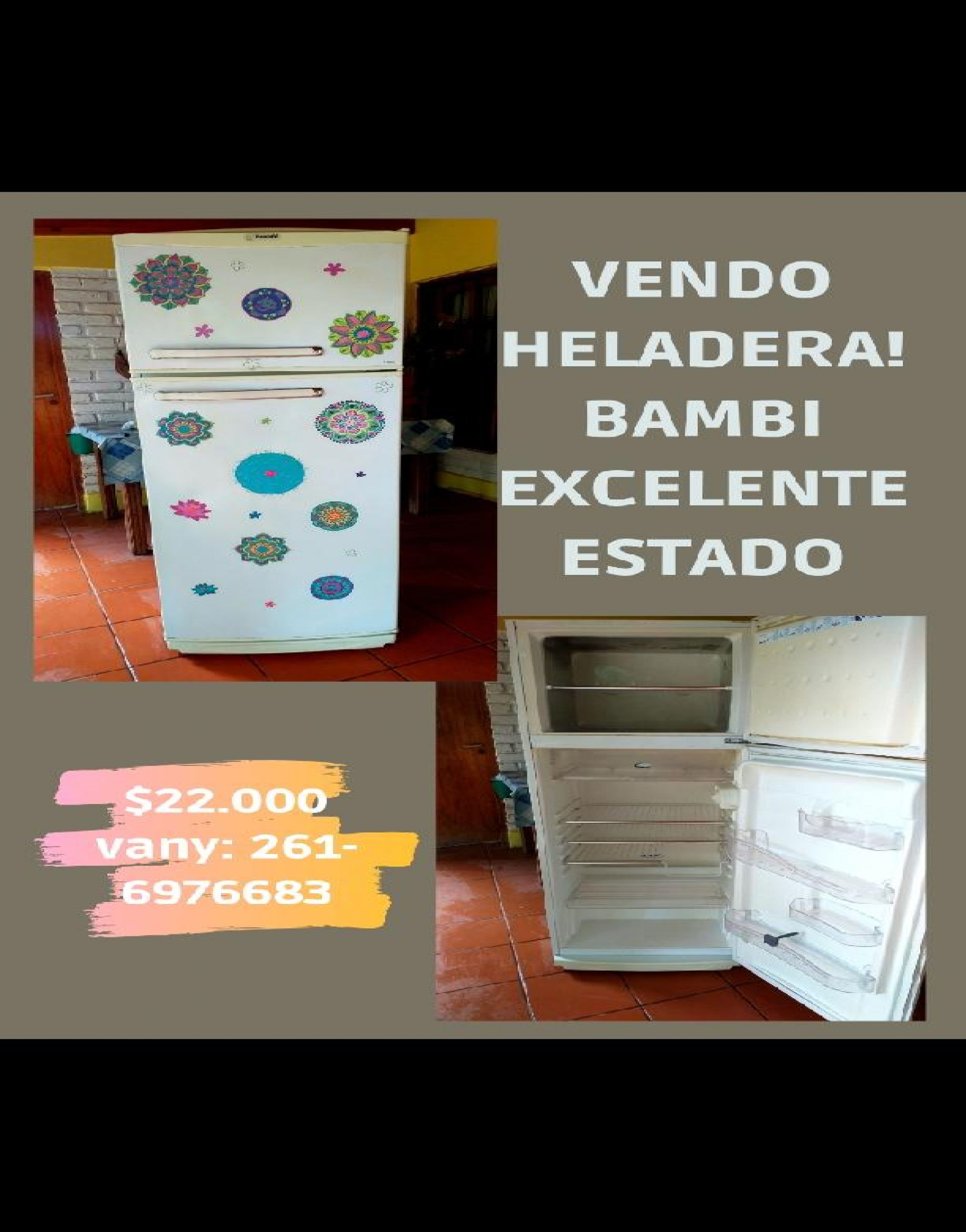 Vendo heladera ! Marca bambi , excelente estado.... $22.000 solo efectivo. Cell: 261-6976683 vanina.