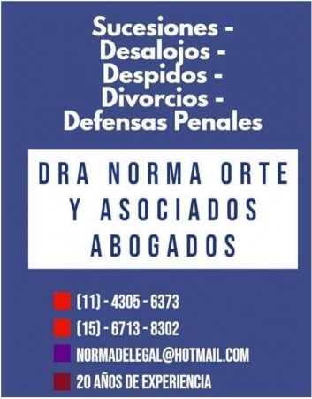 ESTUDIO JURIDICO, 30 años de experiencia en:DIVORCIOS EXPRESS, con una o ambas partes, con la nueva ley, se puede divorciar, cuotas.Alimentos,Tenencias.Violencia,Visitas.–DESPIDOS, defensa del trabajador.DEFENSA PENAL, siempre su mejor estrategia, cuotas.SUCESIONES, con o sin partidas, disponga de los bienes del sucesorioDESALOJOS, alquileres.contratos, OFICINA :SAN CRISTOBAL, (SAN JUAN Y ENTRE RIOS), CENTRO. DRA. ORTE NORMA, DR DE SIMONE PABLO, 4305-6373 156-713-8302 . WATTSAPP. Mail: normadelegal@hotmail.com