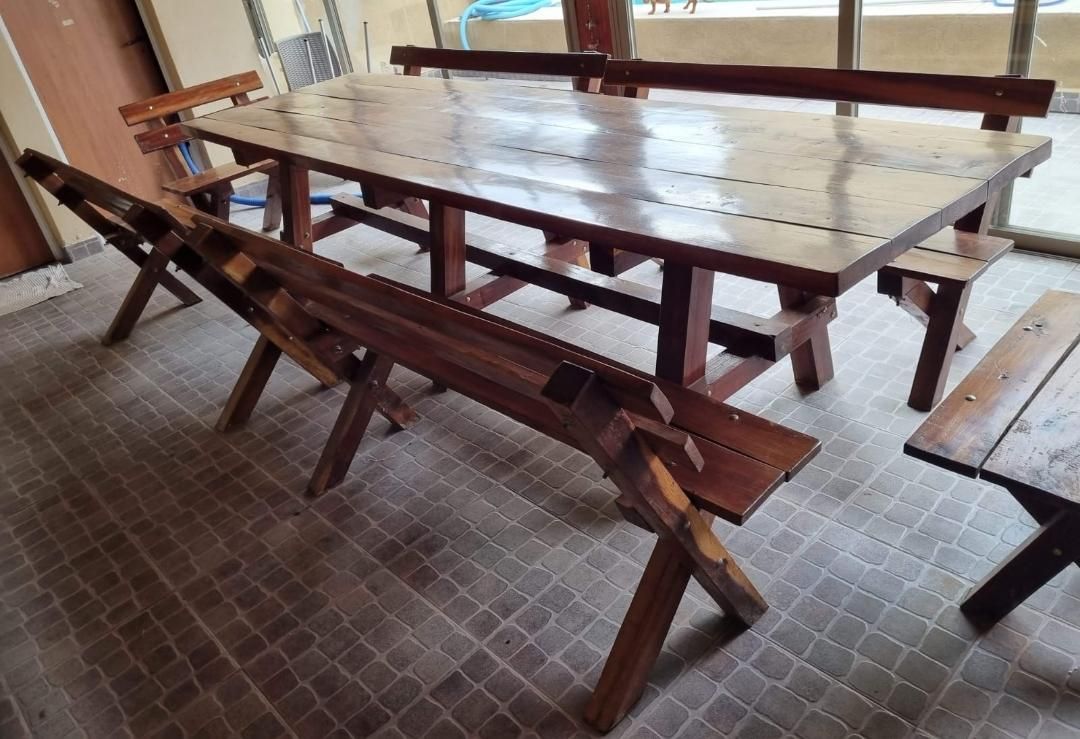 Vendo juego de quincho. Quebracho colorado. Medidas: 3,20 largo x 1,00 ancho + 6 bancos con respaldo