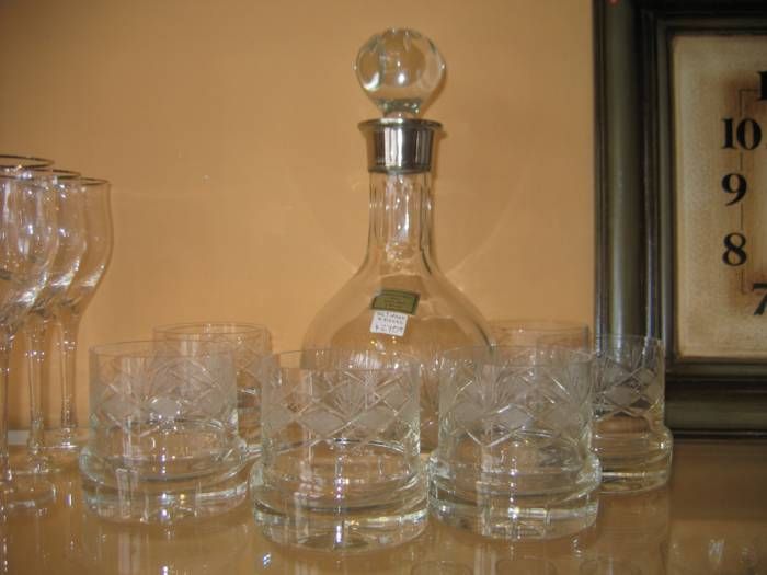 Set de 7 piezas, botella y 6 vasos, cristal tallado a mano.