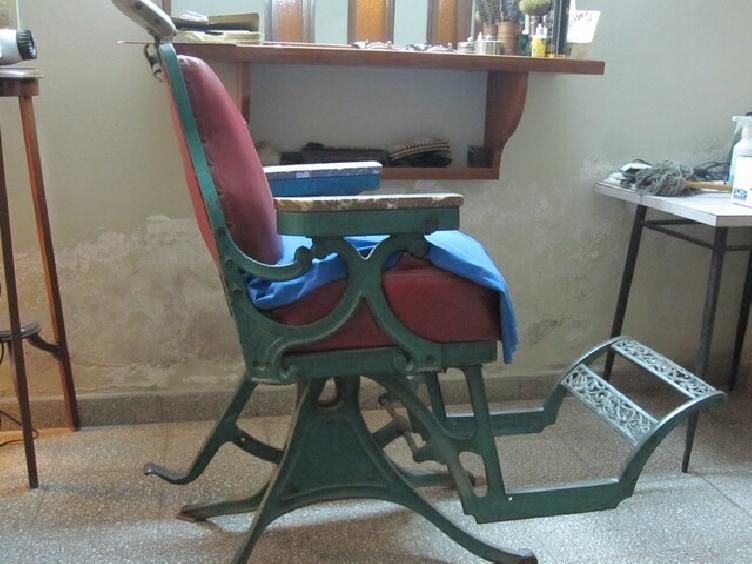sillón de peluquería antiguo, estructura de hierro con apoyabrazos en mármol