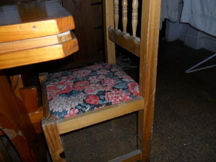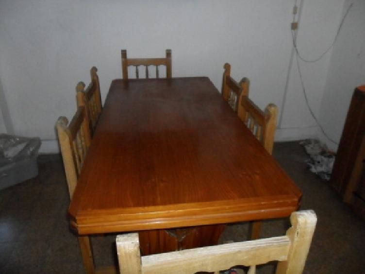 Tapa impecable y bien lustrada, sillas con tapizado impecable, a barnizar madera y las patas de la mesa