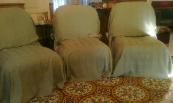 VENDO JUEGO TRES SILLONES TIPO POLTRONA TAPIZADOS COLOR ROJO CON CUBRE SILLONES COLOR VERDE.