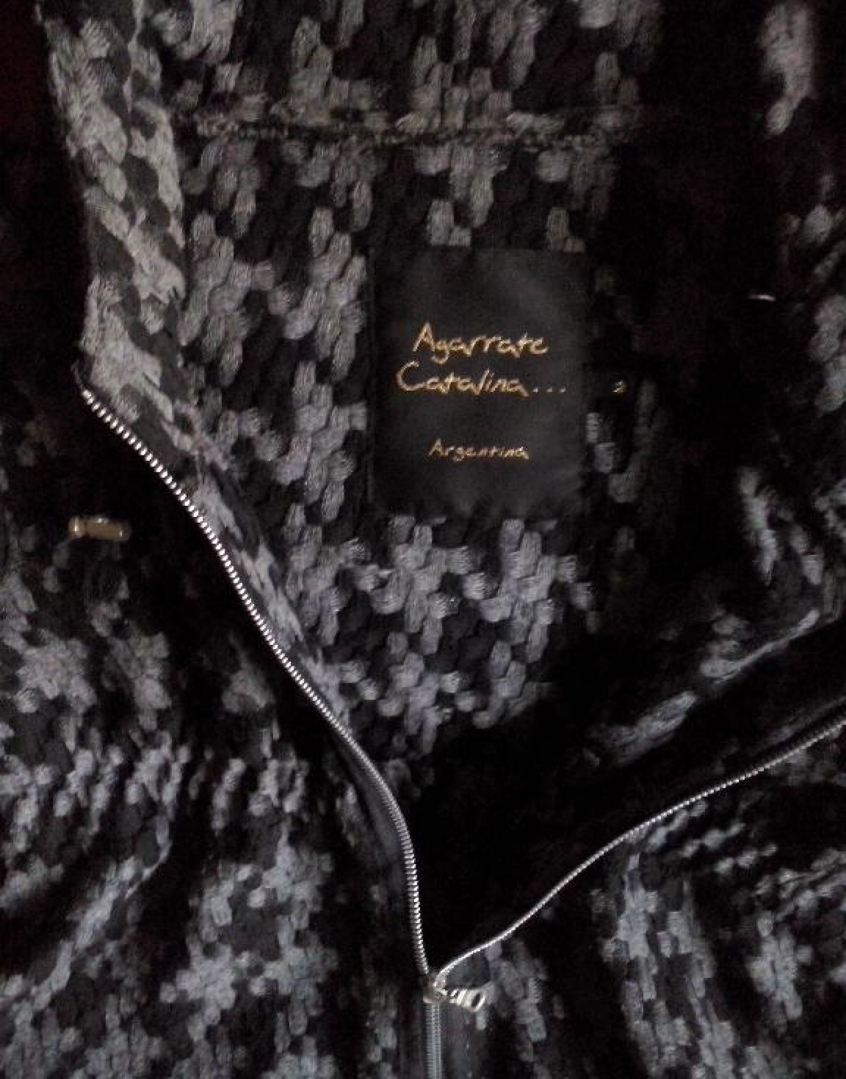 Campera larga con cierre y capucha, gris con negro simil tejido rustico y grueso. Abrigada poco uso, perfecto estado. Entallada hasta por debajo del pecho.