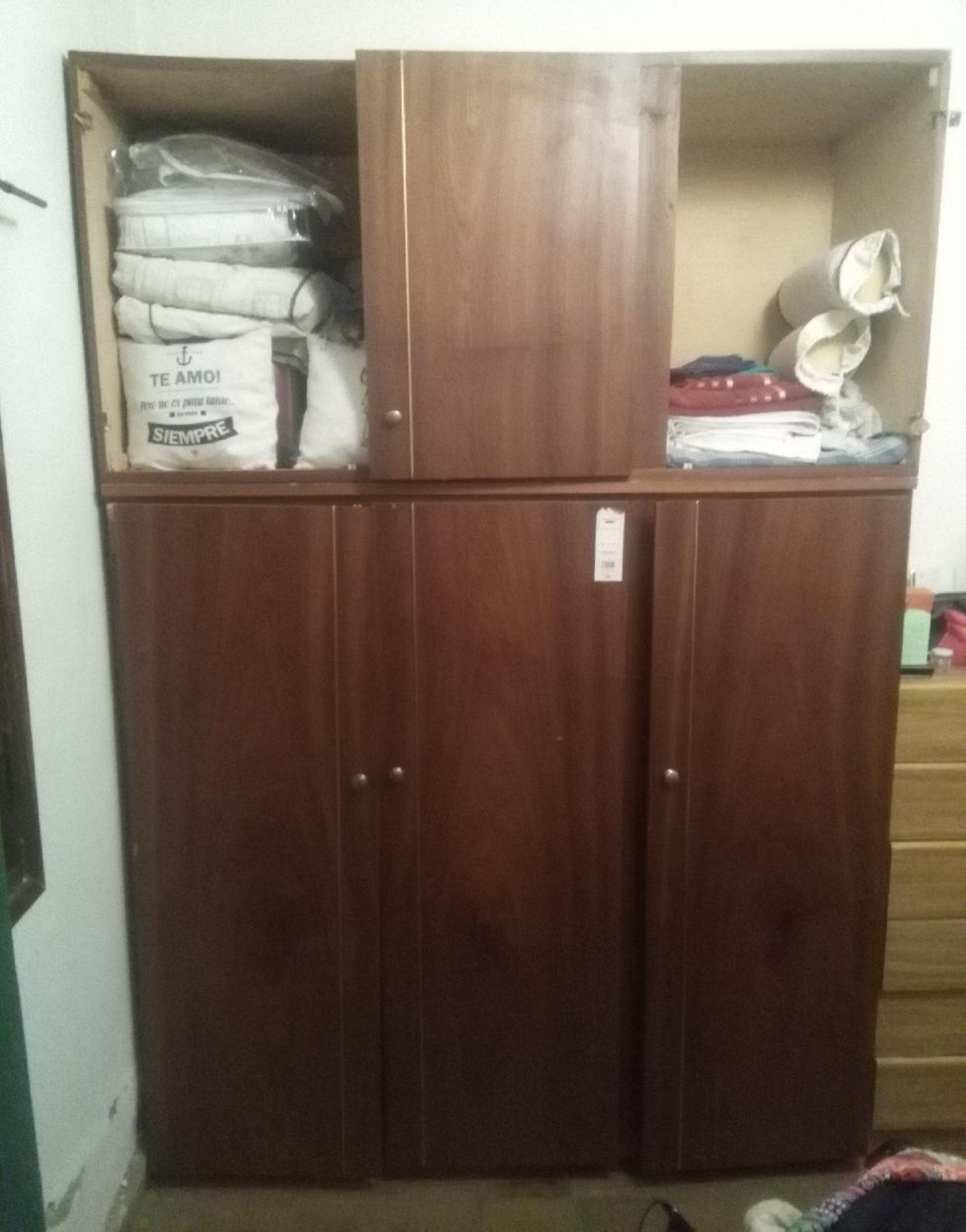 Ropero 3 cuerpos sector para perchas + sector para pantalones + cajonera y tres puertas superiores.