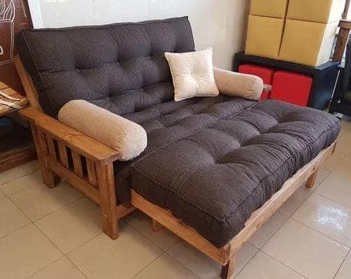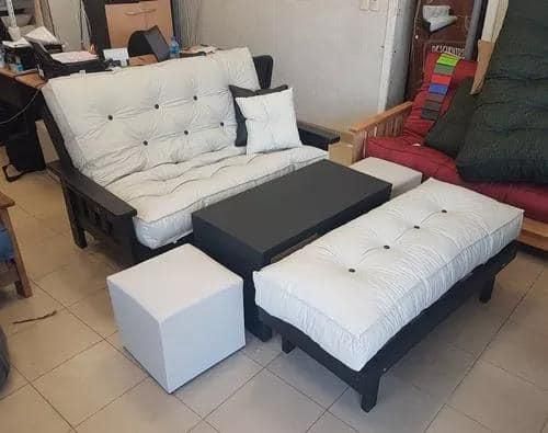 Estructura de madera Pino Cipres Con parrillas reforzadas de 4 x 1.5 Pulgadas.Medidas:Posición sillónLargo 1,55 mtrProfundo 1,00 mtrPiecera 1,40 x 0,50Posición Cama1,90 x 1,40INCLUYEFuton 2 cuerpos pieceraColchón con costuras REFORZADAS \"46 botones\"TALLER SJ : AV SARMIENTO 42 SUR DEPARTAMENTO JACHAL SAN JUAN