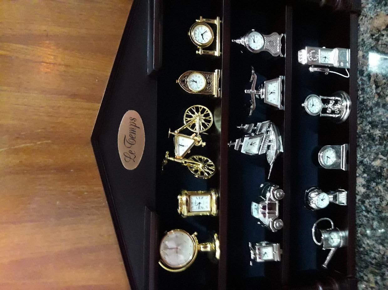 Relojes en miniatura con exibidor de madera.Nuevos