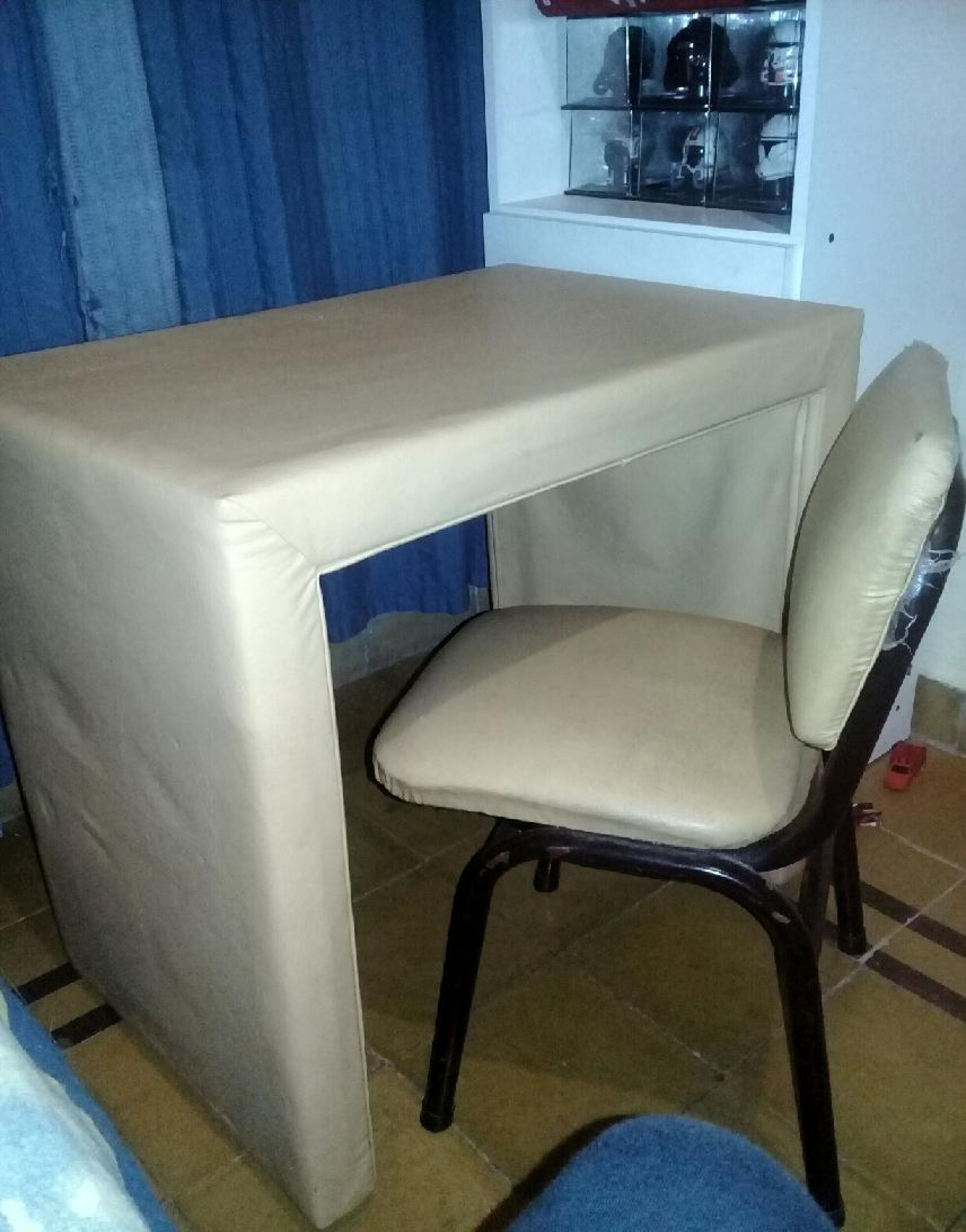Mesita forrada con cuerina más una sillita de caño al tono para niño de hasta 10años.