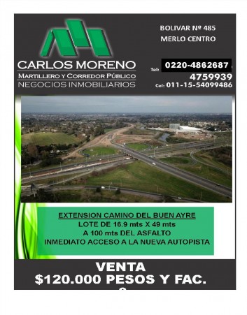 Obra monumental para extender el camino del Buen Ayre desde Acceso Oeste hasta la AU 2.Se trata de un total de 83 km de traza completamente nueva que unirá por primera vez 12 municipios entre sí y con los accesos a Buenos Aires y La Plata, comunicando a un total de 12 millones de personas.A SOLO 100 mts DEL ASFALTO. INMEDIATO ACCESO A LA NUEVA AUTOPISTAA SOLO 3 MINUTOS DEL CENTRO URBANOCOLECTIVOS, COLEGIOS