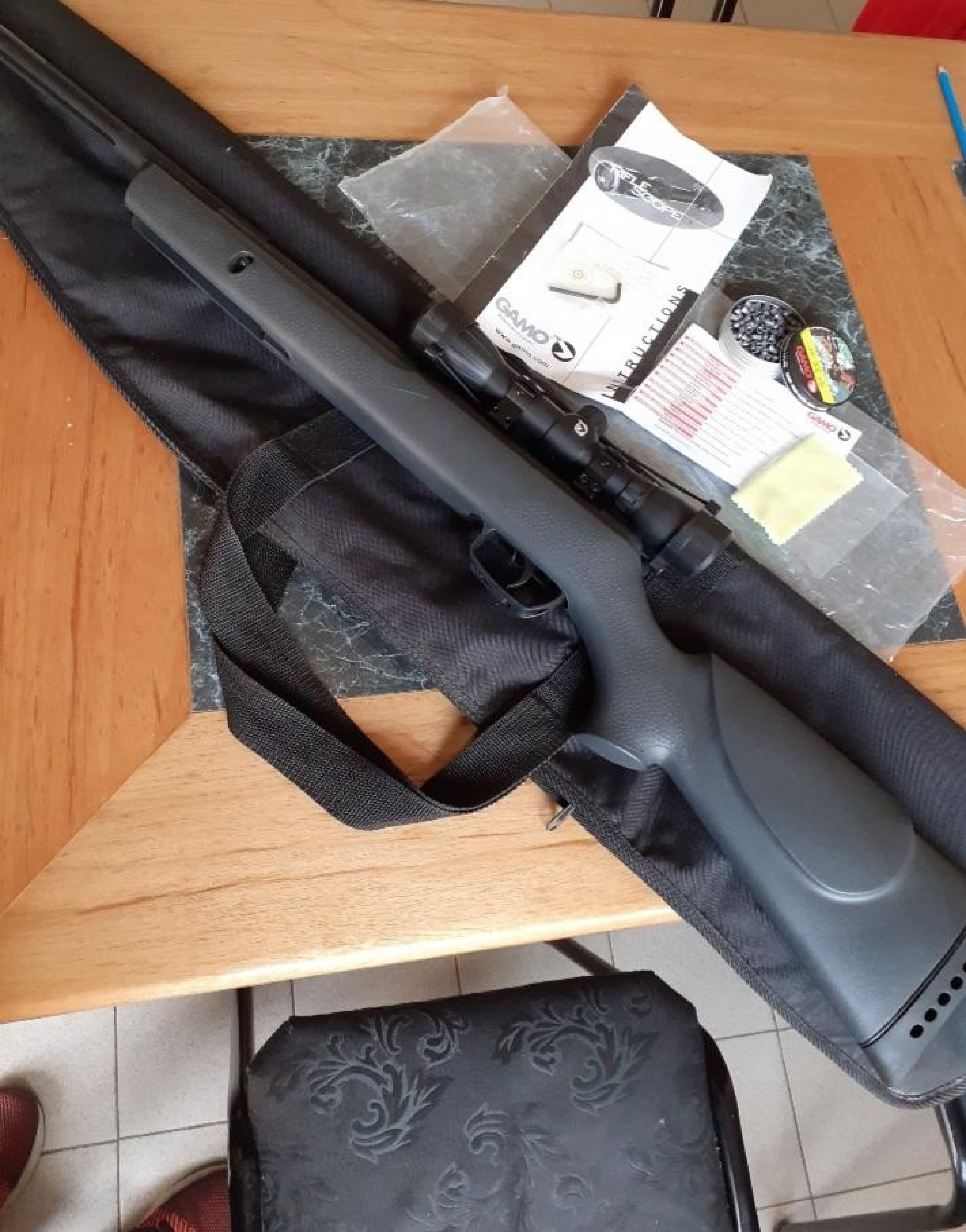 Liquido ya rifle aire comprimido 5.5mm con mira telescópica, funda ,caja completa de balines y manuales ( nuevo)