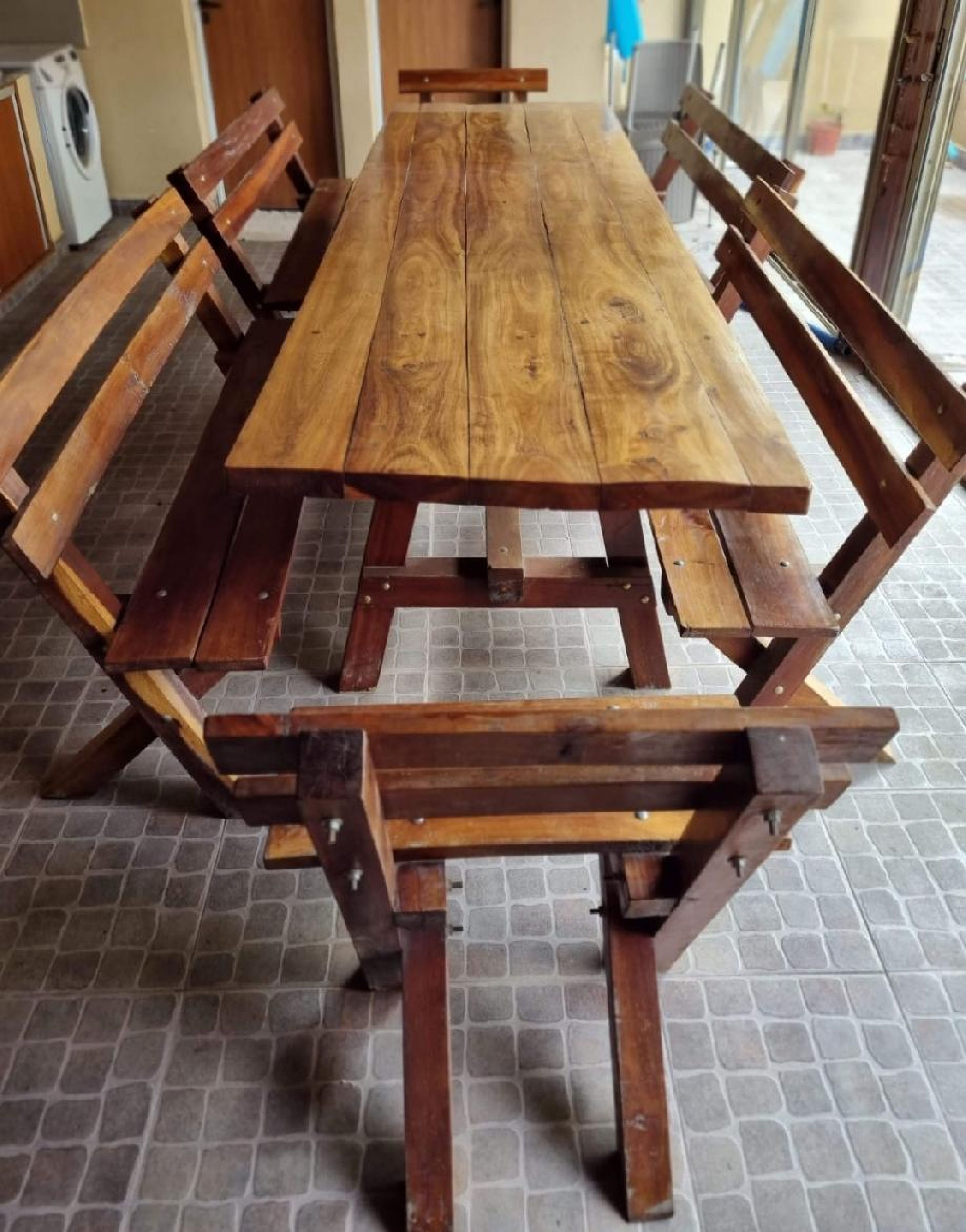 Vendo juego de quincho. Quebracho colorado. Medidas: 3,20 largo x 1,00 ancho + 6 bancos con respaldo